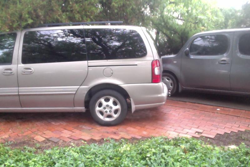 Below, pix of landscaping with the same theme that I hope to go with at Foggy Woods: Red bricks, periwinkle, slanted angles (herringbone), wood chips, no grass, loads of evergreens, some very old bricks.