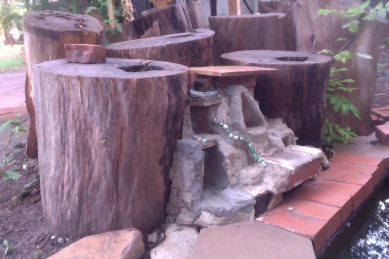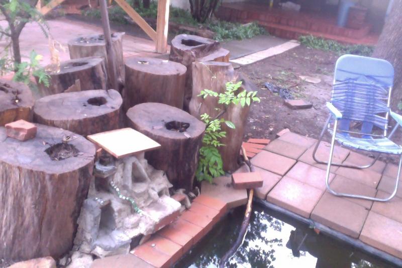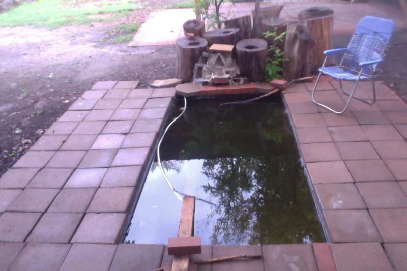 The middle set are of the pond. It's an unexpected social center. Neighbors who feel like visiting go out walking and sit down at the pond and join other neighbors or someone else. I've looked out and seen three unrelated people who just happened to show up. The 2x4 and the branch going into the water are both pathways to freedom for toads and lizards that fall into the pond. The 'pueblo' at one end just looks neat with water falling from it and candles lit at night.